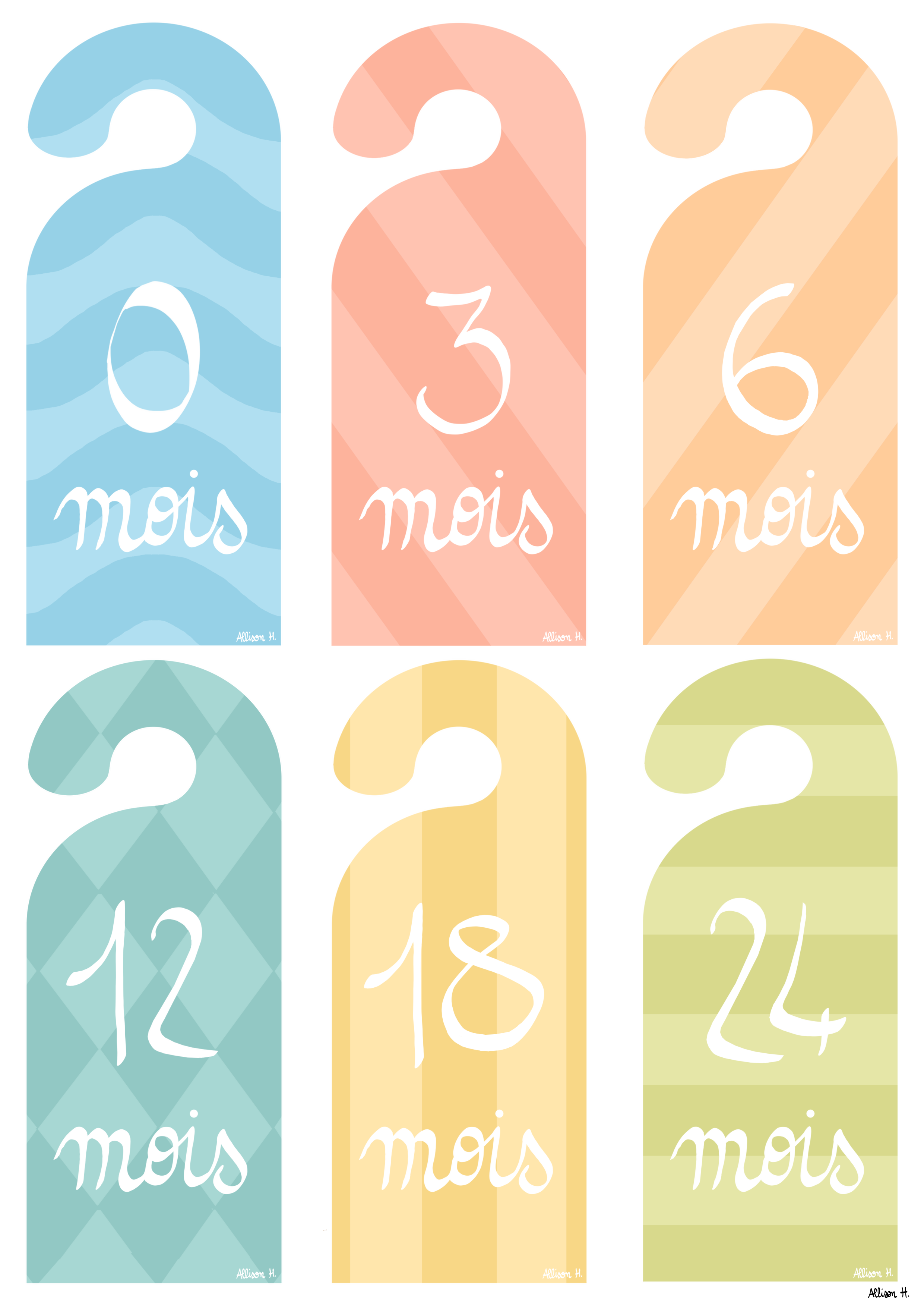 Ces séparateurs sont aux mêmes couleurs que les autres éléments de cette mini-collection « Nursery » et sont au nombre de 6 : 0 mois, 3 mois, 6 mois, 12 mois, 18 mois et 24 mois.