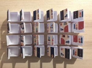 Concernant le calendrier en lui-même, cette année, c’est back to basics ! Il est composé de 24 boîtes carrées (donc plus faciles à monter que les triangles d’autrefois hein ^^), où on peut glisser pleins de petits objets ou chocolats ;).