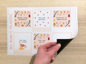 2 • Découper les polaroïds 1 et 2bis • Si vous n'avez pas de papier magnétique, vous pouvez aussi les imprimer sur du papier bristol, les découper et coller au dos du scotch magnétique Ça y est, vos magnets polaroïds sont prêts à être accrochés au bureau ou sur le frigo :)