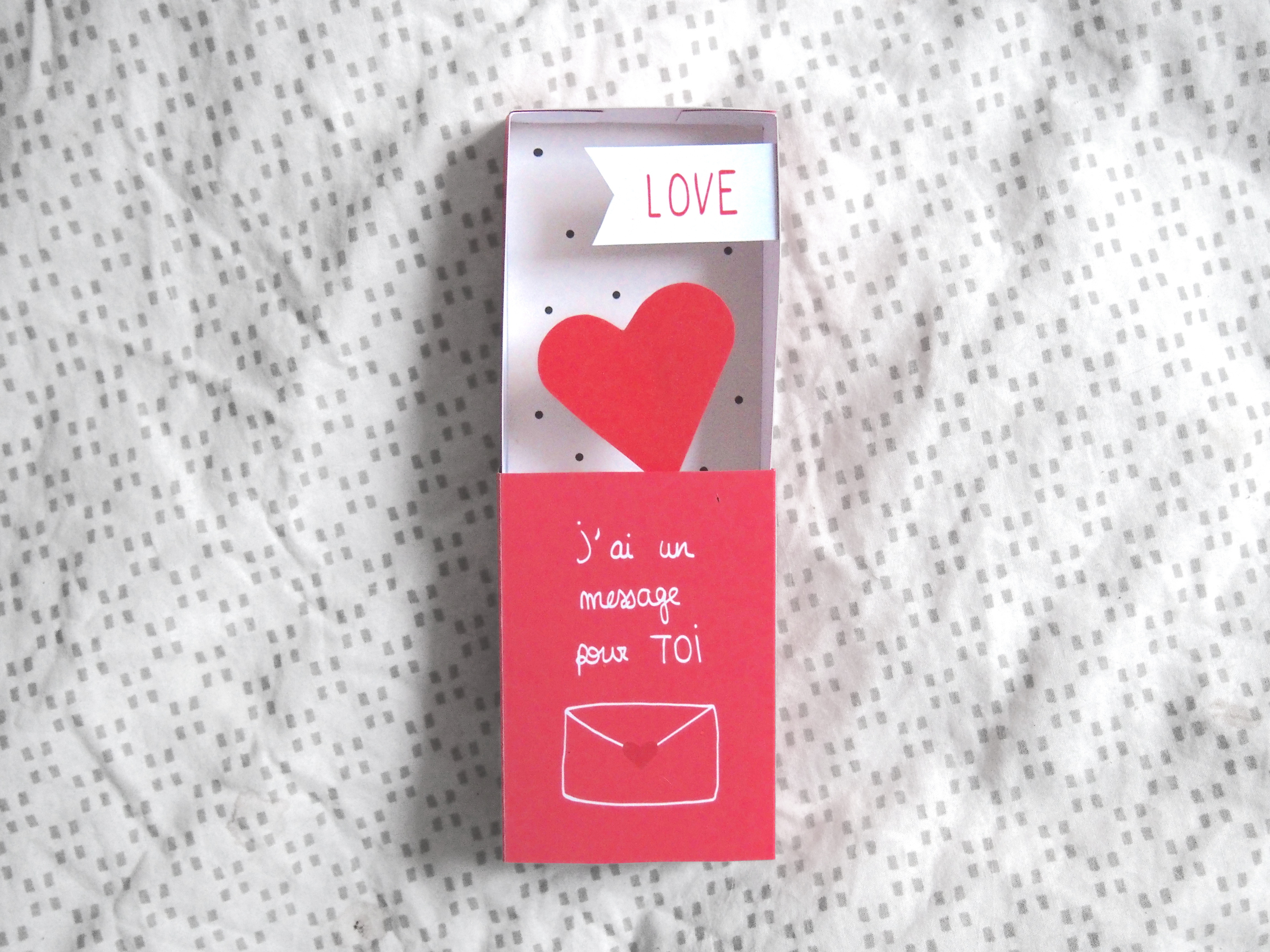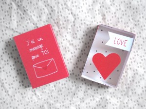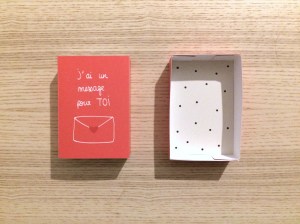 J’ai donc pensé à tous les gens qui, comme moi, ne sont pas très à l’aise à l’oral, ne trouvent jamais le bon moment, trouvent que ça fait bizarre de le dire… Et j’ai créé cette petite pocket box pour faire passer directement le message ! Ici, pas de doutes, le cœur est assez explicite ^^. C’est comme une petite boîte surprise pleine d’amour, avec un cœur qui bondit en dehors de la boite quand on l’ouvre (oui, enfin bondir, je m’emballe peut-être un peu ^^). Et il y a même un message que vous pouvez personnaliser !