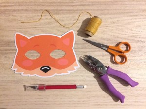 DIY - MASQUES RENARD ET CERF EN PAPIER Matériel : • le masque renard à télécharger ici et le cerf ici • 1 feuille de papier bristol par masque • des ciseaux • un cutter • une perforatrice • du joli fil ou ruban Étapes :1 • Imprimer le masque • Découper le masque aux ciseaux et les yeux au cutter • Percer les deux trous sur les côtés avec une perforatrice