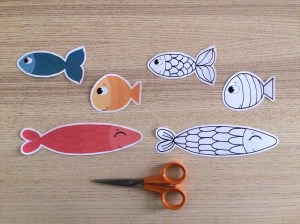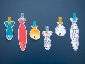 2 • Mettre un bout de scotch ou masking tape au niveau de la queue de chaque poisson Ça y est, les petits poissons sont prêts à être accrochés ! ;)