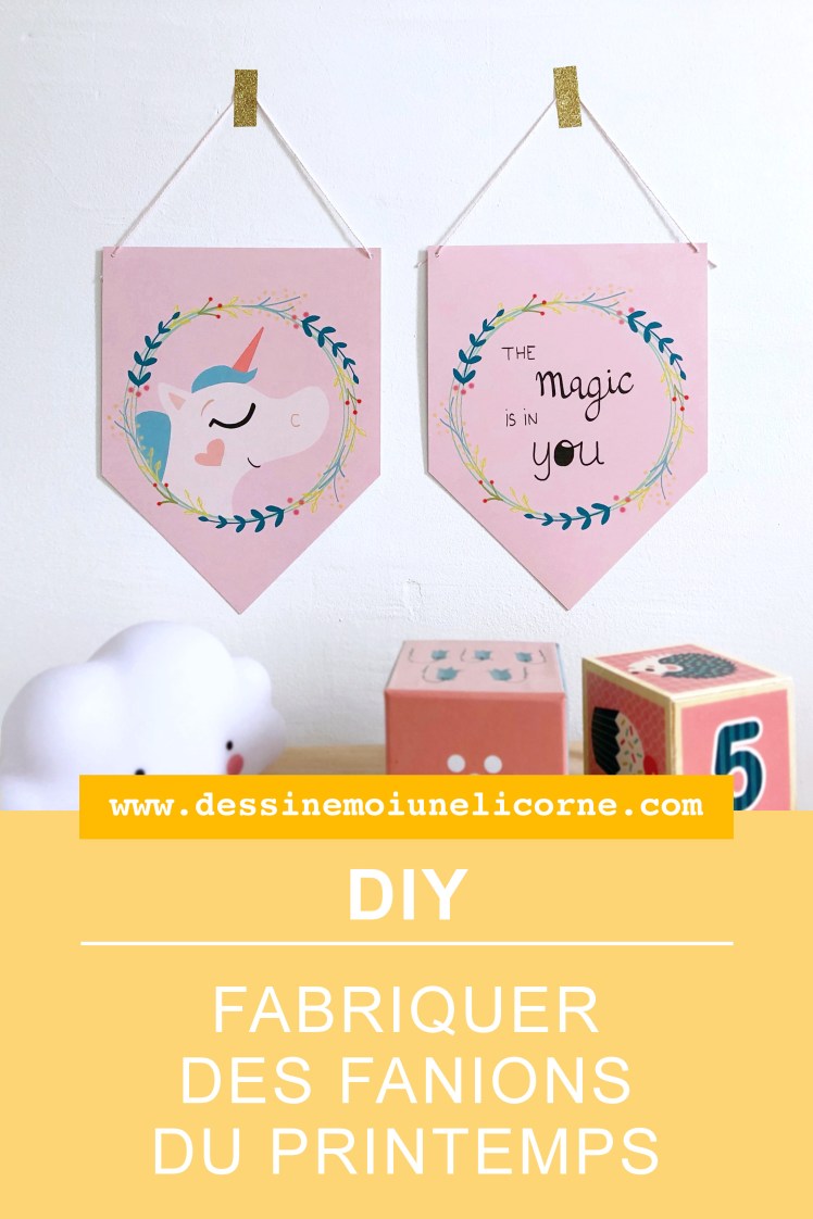Ces fanions reprennent la licorne du gif célébrant le printemps que j’ai posté sur mon Instagram et avec le calendrier du mois d’avril il y a quelques temps. Et la couronne a quitté ses tons bleus et froids pour des tons verts et printaniers, saison oblige ;)