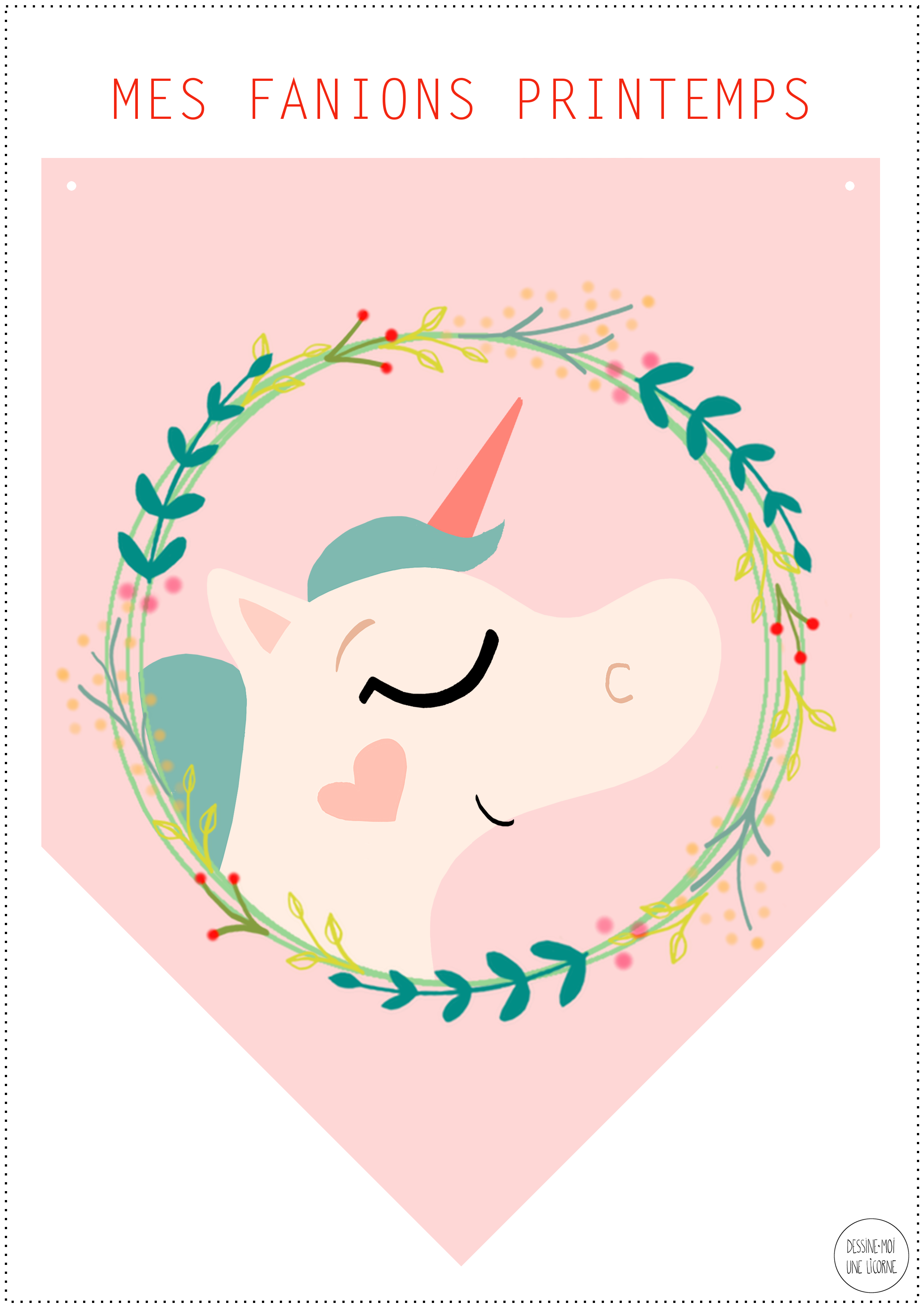Ces fanions reprennent la licorne du gif célébrant le printemps que j’ai posté sur mon Instagram et avec le calendrier du mois d’avril il y a quelques temps. Et la couronne a quitté ses tons bleus et froids pour des tons verts et printaniers, saison oblige ;)
