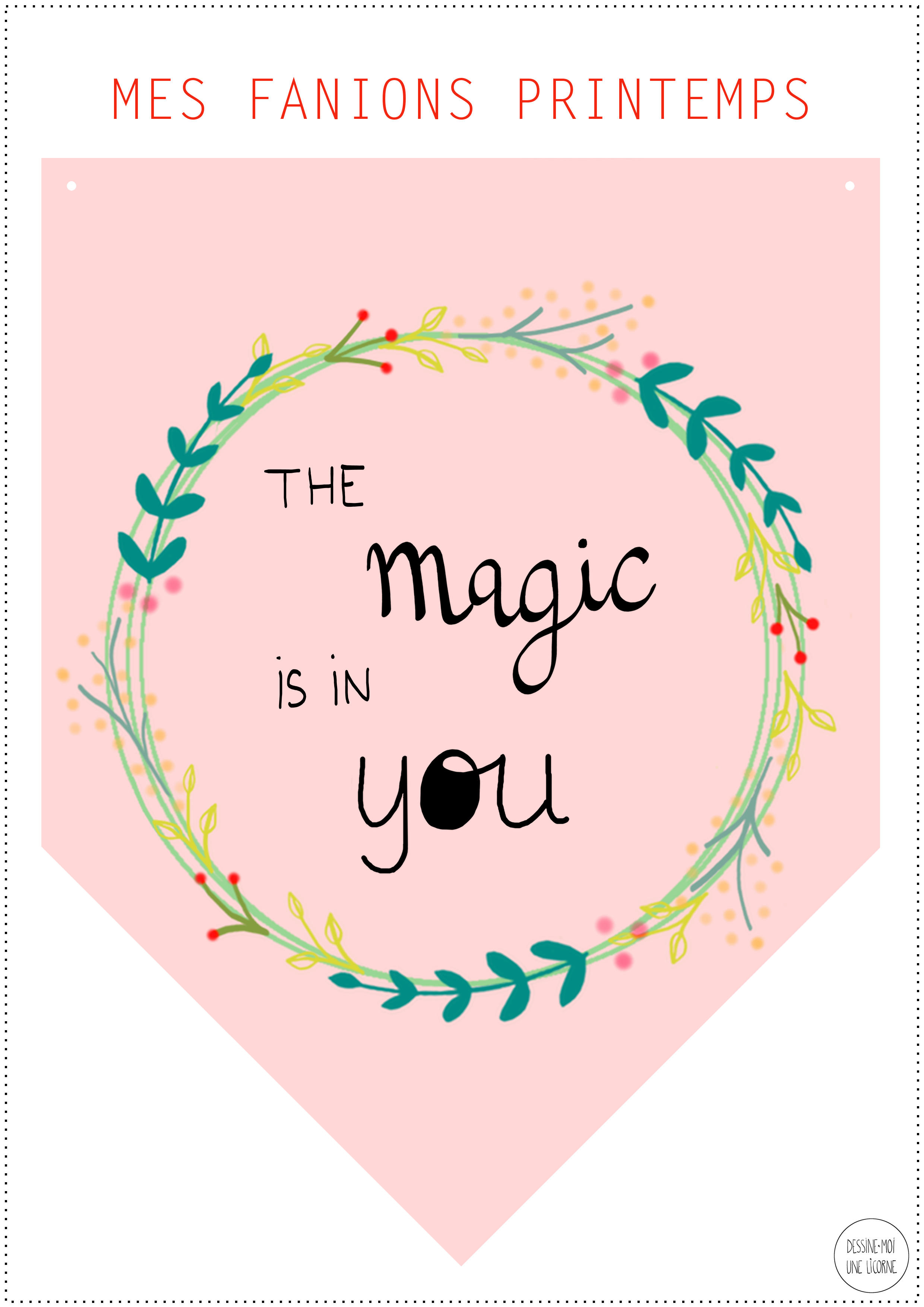 Ainsi, sur un des fanions, il y a une petite licorne, et sur l’autre, il y a une citation positive et bienveillante en lettering pour se redonner confiance en soi. J’ai choisi « The magic is in you », comme un clin d’œil à la licorne. Parce qu’à défaut de licornes magiques dans le monde réel, il y a en chacun de nous – de façon souvent insoupçonnée – de la magie ;)