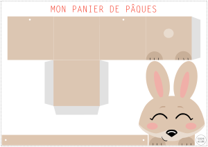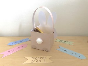 Pour le décor du panier, j’ai repris le lapin de Pâques de la chasse aux œufs, pour être raccord ;) Le panier fait environ 6 cm x 6,5 cm x 6 cm. Mais vous pouvez l’imprimer plusieurs fois si vous avez caché trop d’œufs pour sa contenance !