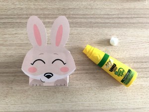3 • Mettre de la colle sur les languettes grises • Replier le panier et coller les languettes • Coller la tête de l'animal sur le devant de la boîte • Former une petite boule avec le coton et la coller sur le rond beige derrière