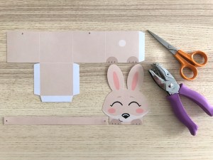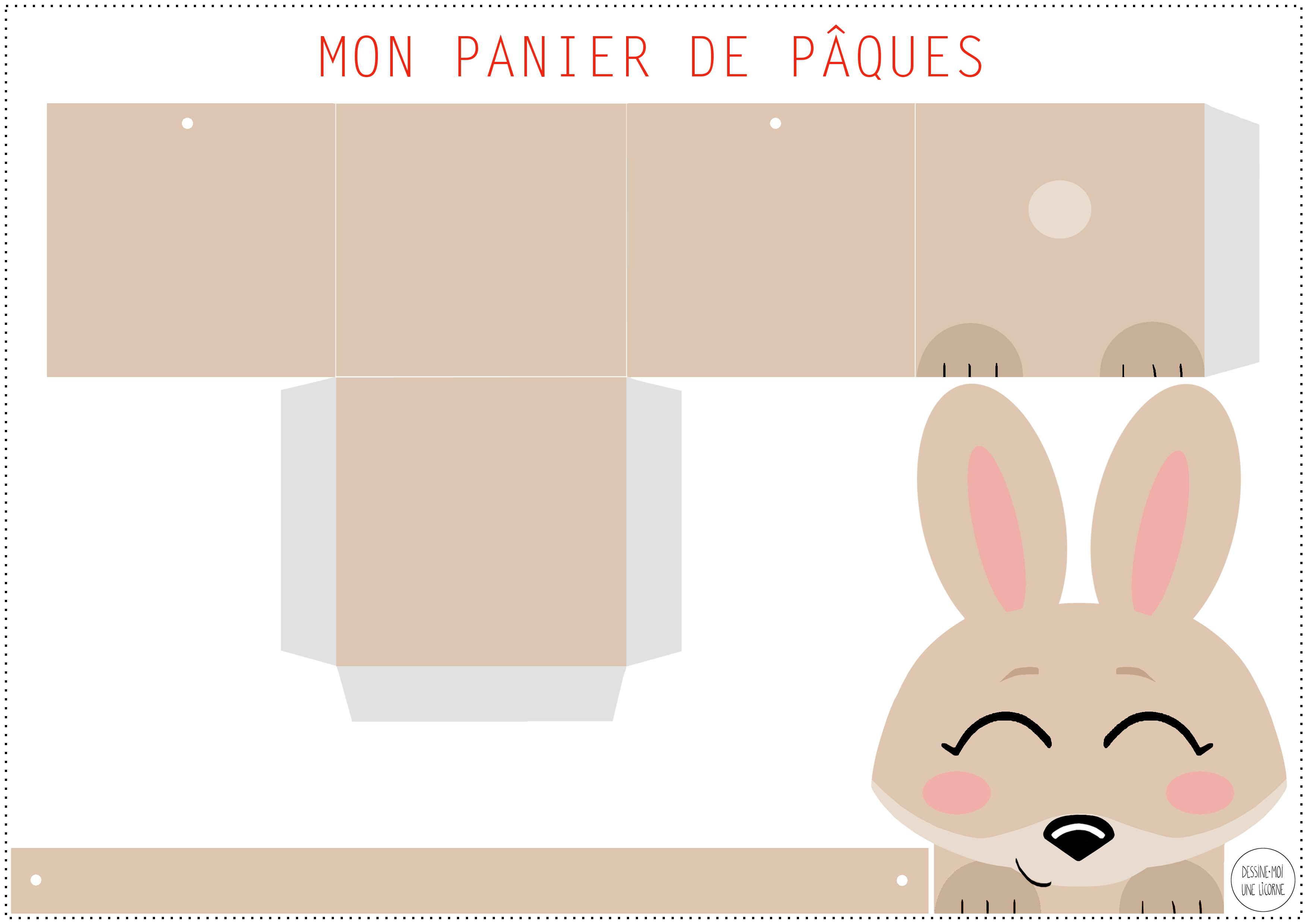 DIY - PANIER À ŒUFS DE PÂQUES Matériel : • le panier téléchargeable ici • 1 feuille de papier bristol • des ciseaux • une perforatrice • un outil à embosser (ou capuchon de stylo) • de la colle • 2 petites attaches-parisiennes • Du coton pour la queue du lapin (facultatif) Étapes :1 • Imprimer le panier • Découper les éléments comme montré à gauche • Percer les 4 trous marqués en blanc sur le panier et l'anse avec une perforatrice