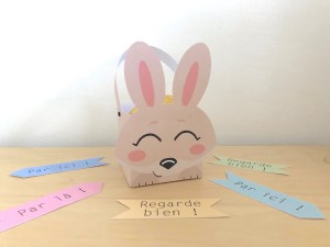 Pour le décor du panier, j’ai repris le lapin de Pâques de la chasse aux œufs, pour être raccord ;) Le panier fait environ 6 cm x 6,5 cm x 6 cm. Mais vous pouvez l’imprimer plusieurs fois si vous avez caché trop d’œufs pour sa contenance !
