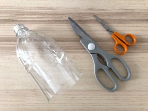 2 • Faire une entaille avec les gros ciseaux dans le bas, assez loin du haut de la bouteille, en pinçant légèrement la bouteille • Couper le bas de la bouteille avec les gros ciseaux • Couper la cloche au niveau du trait de feutre avec