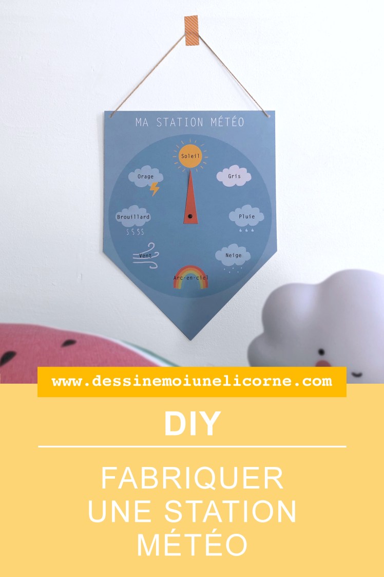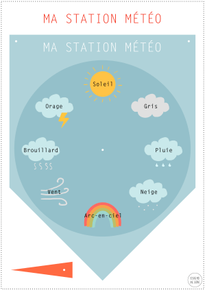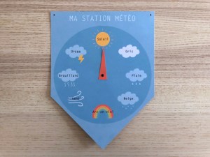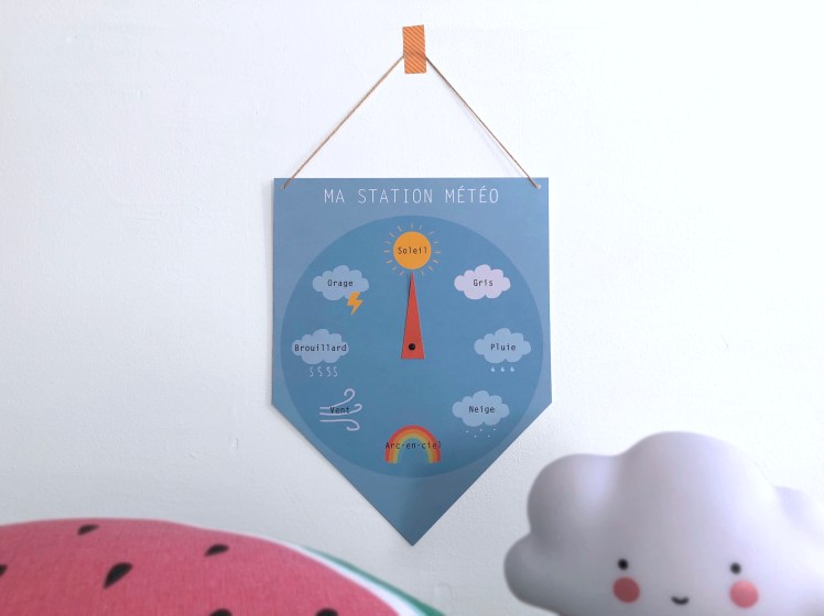 Je me suis dit à ce moment-là que c’était pas encore gagné la compréhension du temps qu’il fait dehors ^^ La semaine dernière, j’ai mis sur l’e-shop de nouvelles affiches éducatives, dont une sur la météo notamment. Et, comme je vous avais proposé pour la version « émotions », je trouve que c’est toujours pas mal de compléter avec un petit objet ludique qui permet de mettre en pratique au quotidien cet apprentissage. J’ai donc créé une petite station météo, comme un petit fanion baromètre avec une flèche que les enfants peuvent déplacer sur le temps qu’il fait en temps réel !