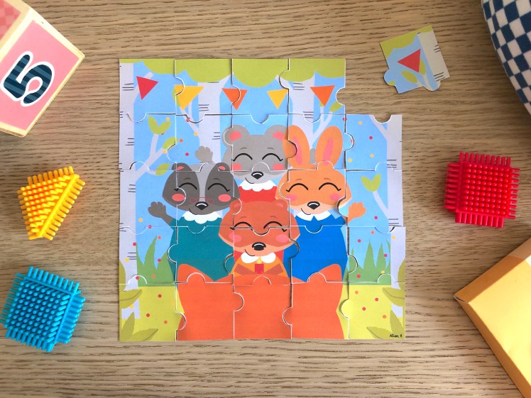 Il fait environ 20 x 20 cm, comporte 25 pièces et est donc adapté pour les enfants dès 3 ans (ou plus tôt si vos enfants sont au taquet ;). Concernant la scène, vous aurez peut-être reconnu l’illustration du Conte de l’été « Une fête surprise » avec mes petits personnages fétiches (conte que vous pouvez d’ailleurs aller lire avec vos petits bouts si ce n’est déjà fait ;).