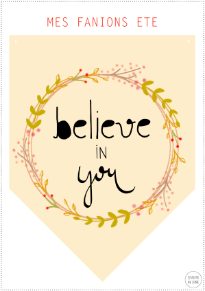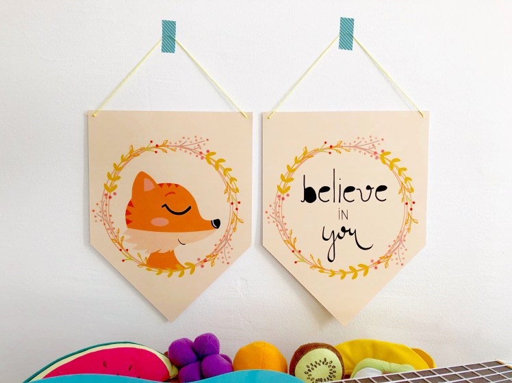 Ainsi, sur un des fanions, il y a un petit tigre, et sur l’autre, il y a une citation positive et bienveillante en lettering pour se redonner confiance en soi. J’ai choisi « Believe in you », pour ne jamais oublier de croire en soi et en ses capacités :)