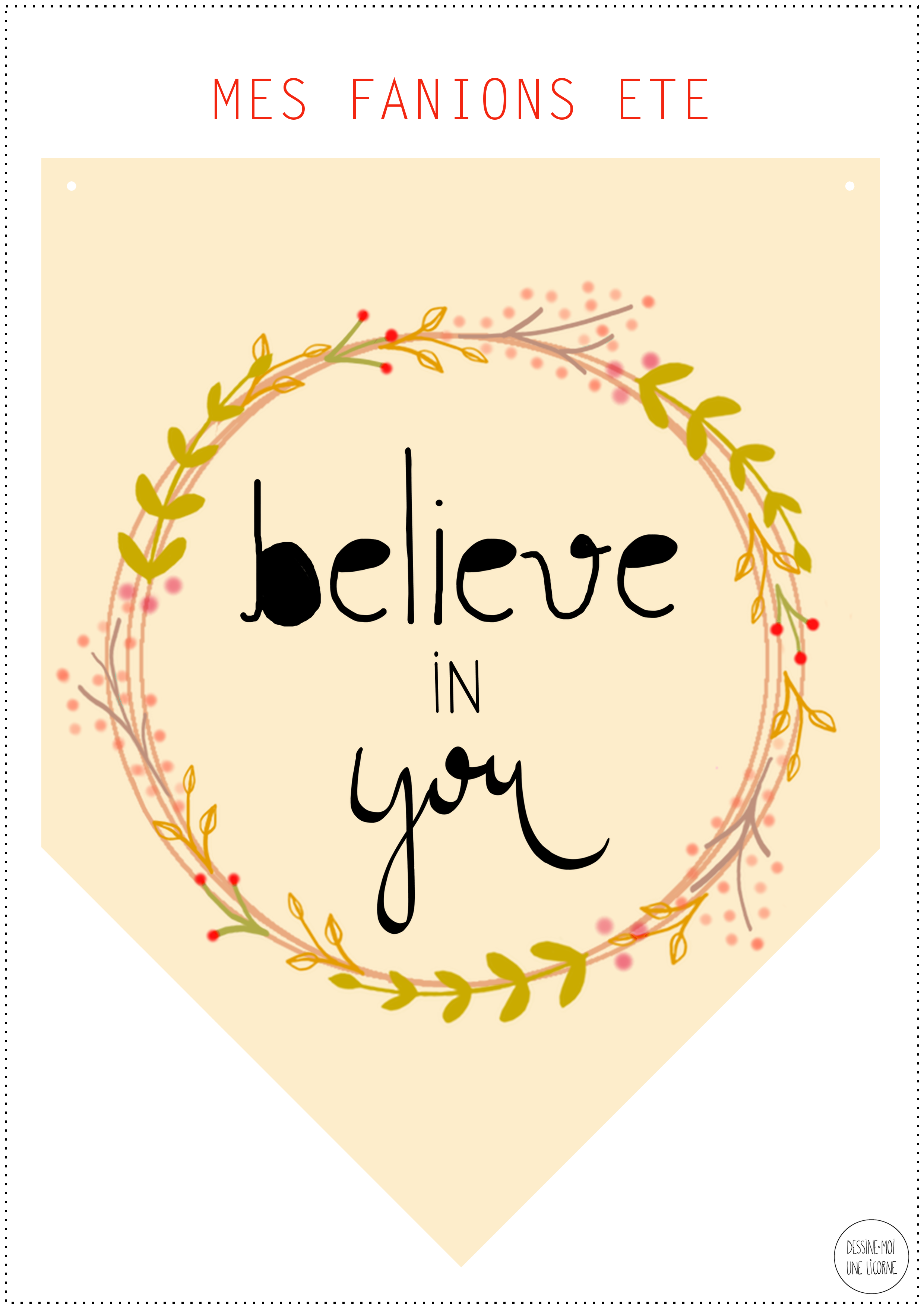 Ainsi, sur un des fanions, il y a un petit tigre, et sur l’autre, il y a une citation positive et bienveillante en lettering pour se redonner confiance en soi. J’ai choisi « Believe in you », pour ne jamais oublier de croire en soi et en ses capacités :)