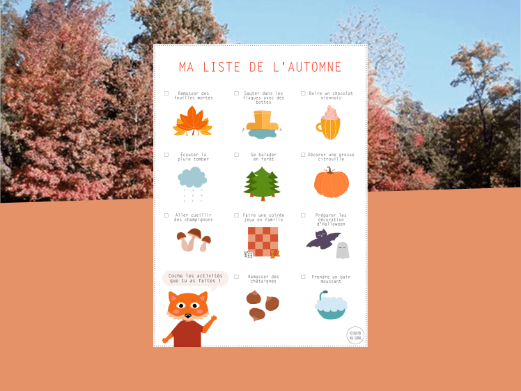 Voici donc pour vous la liste des 11 activités à faire en automne ! J’ai prévu des petites coches avant chaque activité, et aussi un petit Eliott le renard didactique, pour que vos enfants puissent cocher toutes les activités qu’ils auront faites… et boucler cette to-do list ludique (pour une fois qu’on a envie spontanément de faire tous les points de sa liste ^^)