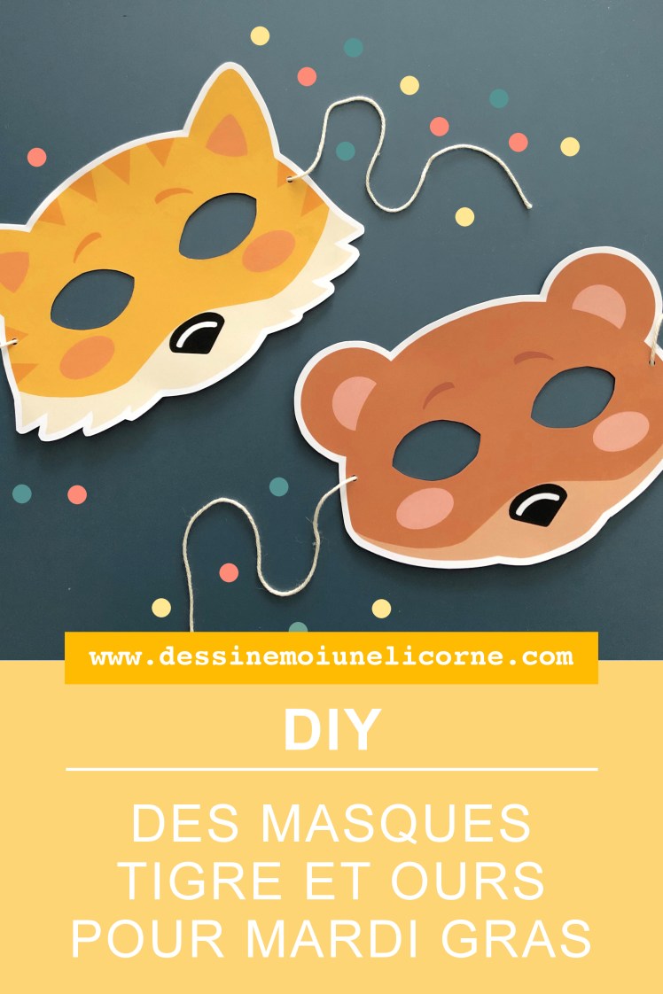 J’espère que vous allez bien ! Le 25 février prochain, c’est mardi gras ! Alors, après les masques renard et cerf que je vous avais proposé l’an dernier en DIY, je vous propose aujourd’hui deux nouveaux animaux faciles et rapides à faire pour vos bouts de chou : les masques animaux tigre et ours en papier ! Vous allez voir, en 5 minutes c’est fait ;)