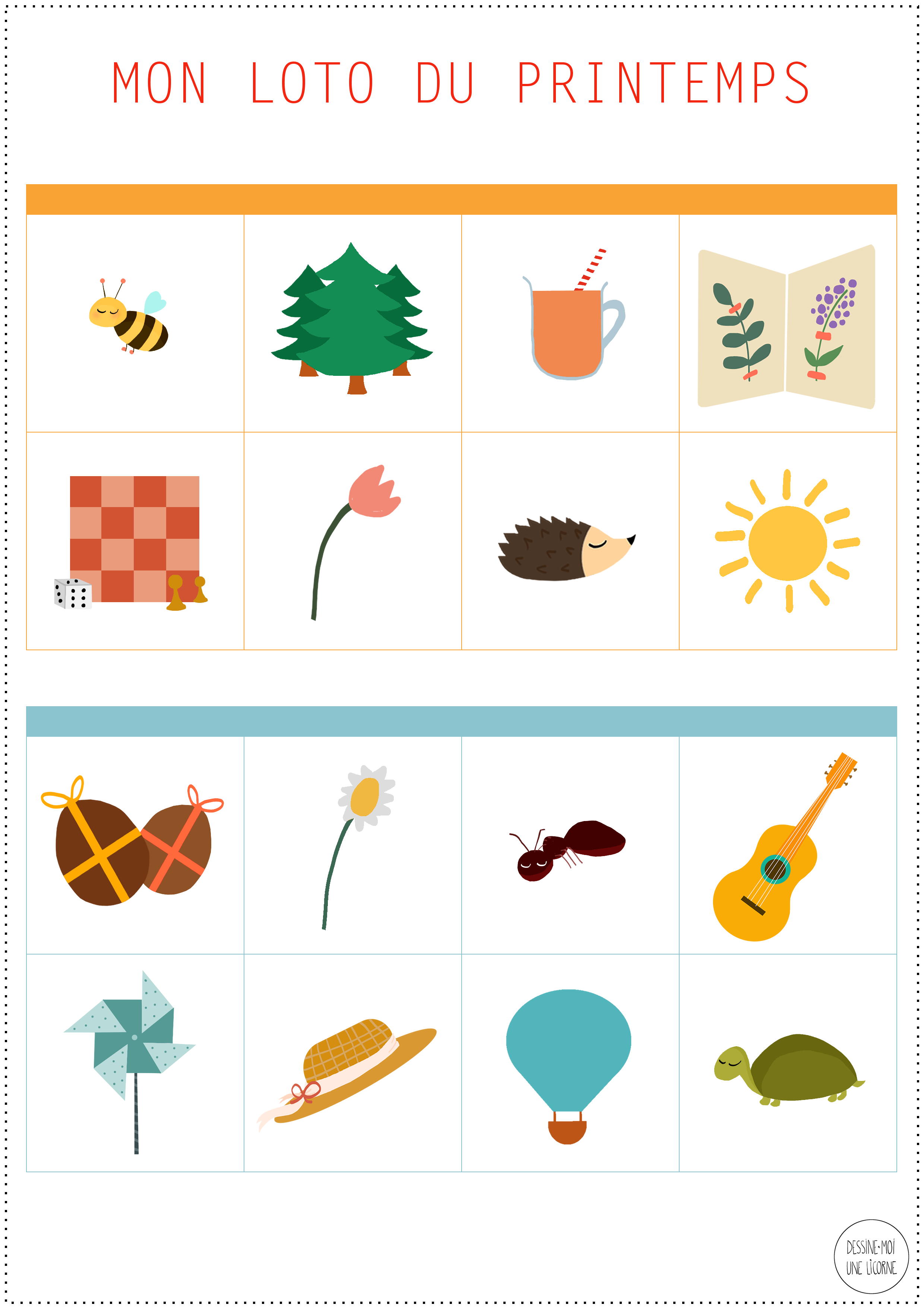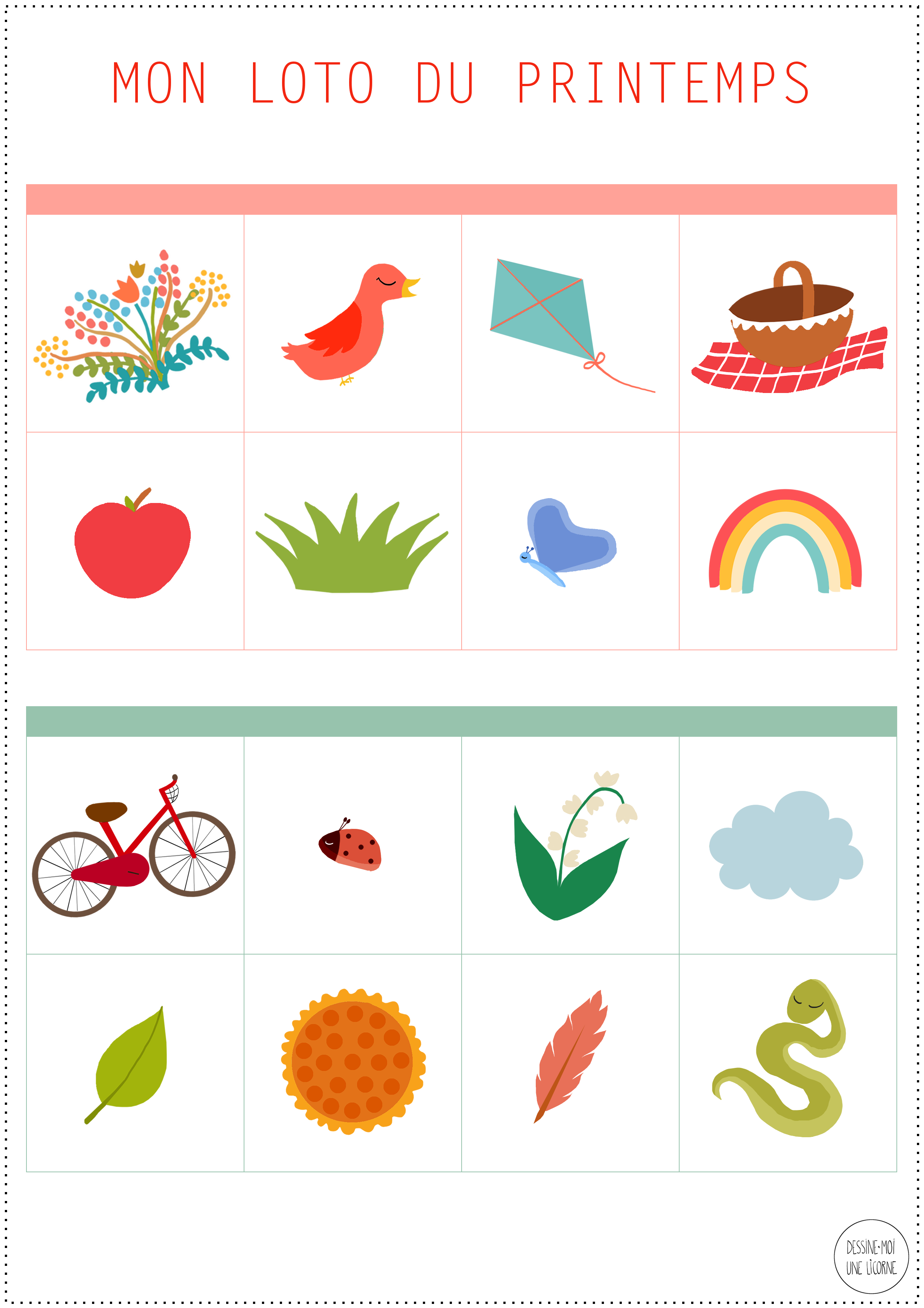 DIY - LOTO DU PRINTEMPS Matériel : • les planches, téléchargeables ici et ici • 4 feuilles de papier bristol • des ciseaux Étapes :1 • Imprimer les 2 planches en 2 exemplaires sur le papier bristol • Découper les grandes cartes du premier exemplaire aux ciseaux • Découper les petites cartes du deuxième exemplaire aux ciseaux Ça y est, vos petites cartes sont prêtes pour de folles parties de loto avec vos enfants :)