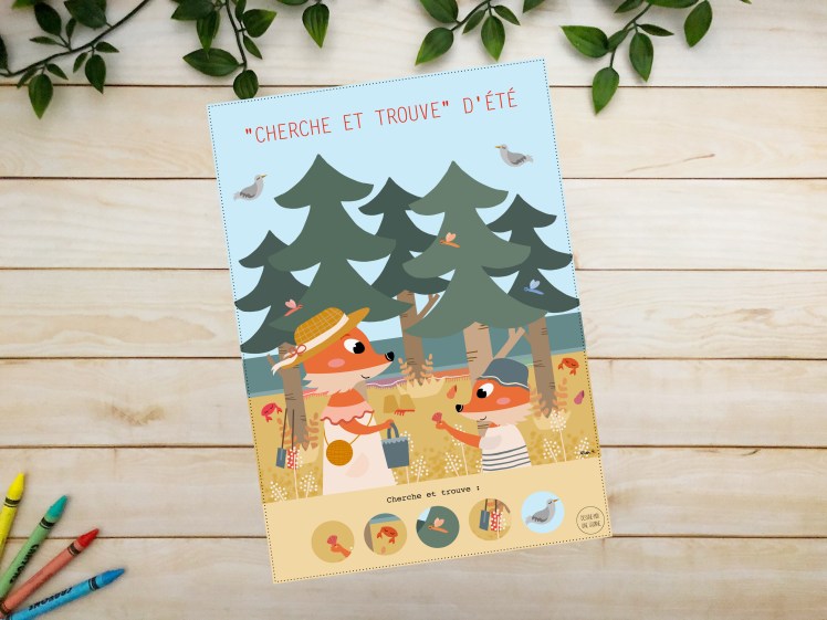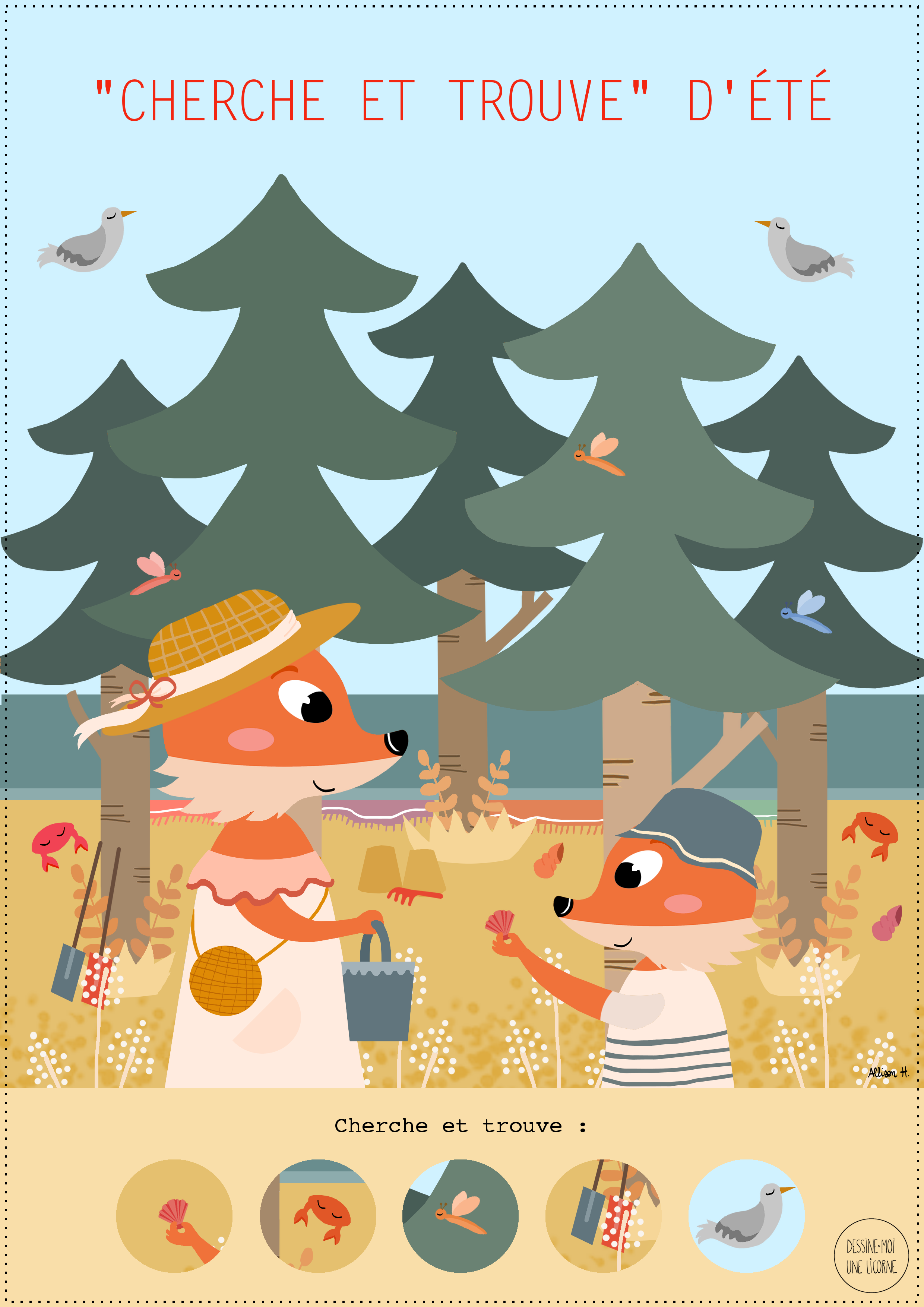Pour ce quatrième et dernier « Cherche et trouve », on plonge dans l’été, la plage et les vacances ! On reste dans la forêt, comme pour l’automne, l’hiver et le printemps, mais il s’agit cette fois-ci d’une forêt de pins à l’orée de la mer ! On y retrouve nos fameux renards, qui cette fois-ci ramassent des coquillages :) Il faut ici chercher et trouver 5 éléments : un coquillage, un crabe (attention à la couleur ;), une libellule, des pelles et une mouette (attention au sens ;) !