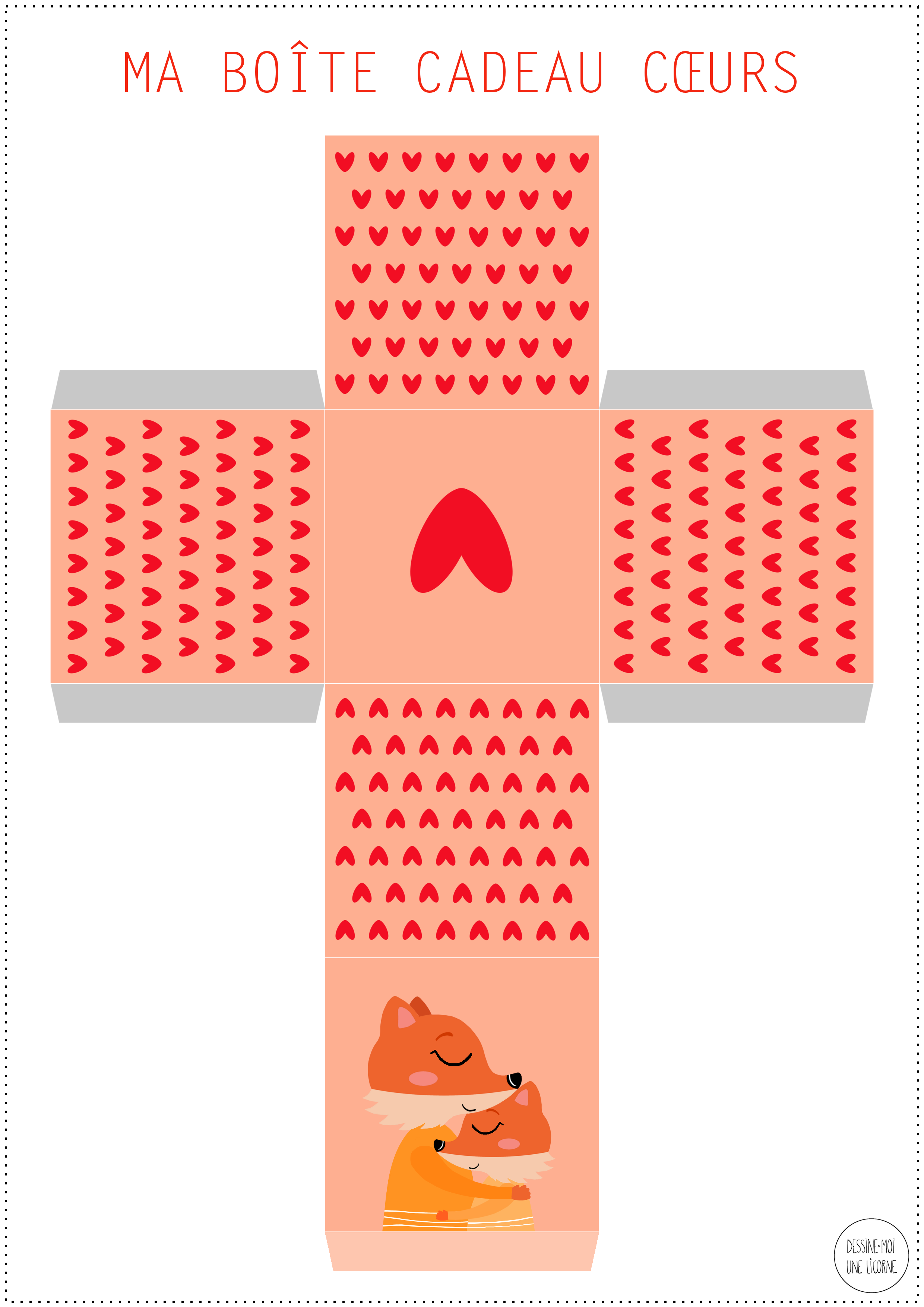 DIY - BOÎTE CADEAU RENARDS CŒURS Matériel : • la planche de la boîte téléchargeable ici • 1 feuille de papier bristol • des ciseaux • un outil à embosser (ou un capuchon de stylo) • de la colle • un cadeau à mettre dans la boîte Étapes :1 • Imprimer la planche sur du papier bristol • Découper la boîte aux ciseaux comme à gauche