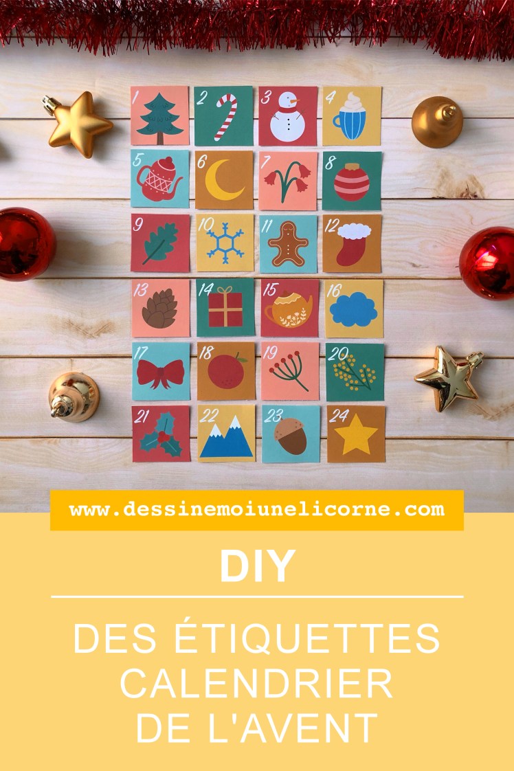 DIY - ÉTIQUETTES CALENDRIER DE L'AVENT Matériel : • les 24 étiquettes, téléchargeables ici • 1 feuille de papier autocollant (ou autre si vous souhaitez en faire des étiquettes à accrocher ou des magnets) • des ciseaux (ou un massicot pour découper plus rapidement) Étapes :1 • Imprimer les étiquettes sur le papier autocollant • Découper les étiquettes aux ciseaux (ou au massicot) Ça y est, vos étiquettes calendrier de l’Avent sont prêtes ! Vous pouvez les coller sur un calendrier en bois ou directement sur les paquets de chaque petit cadeau de l'Avent ;)